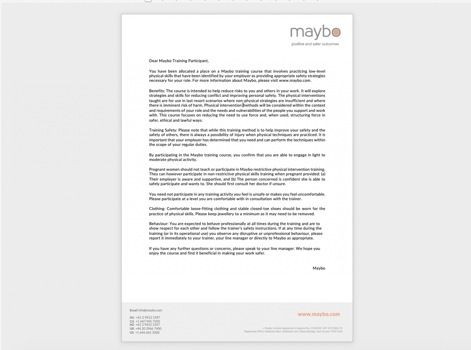 This one-page PDF should be issued to all participants of Maybo courses that will involve the practice of physical skills prior to the day of the course. It can be shared with the link, or downloaded and attached to an email, or printed.