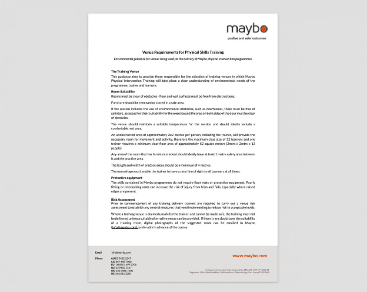 Environmental guidance for venues being used for the delivery of Maybo physical intervention programmes.