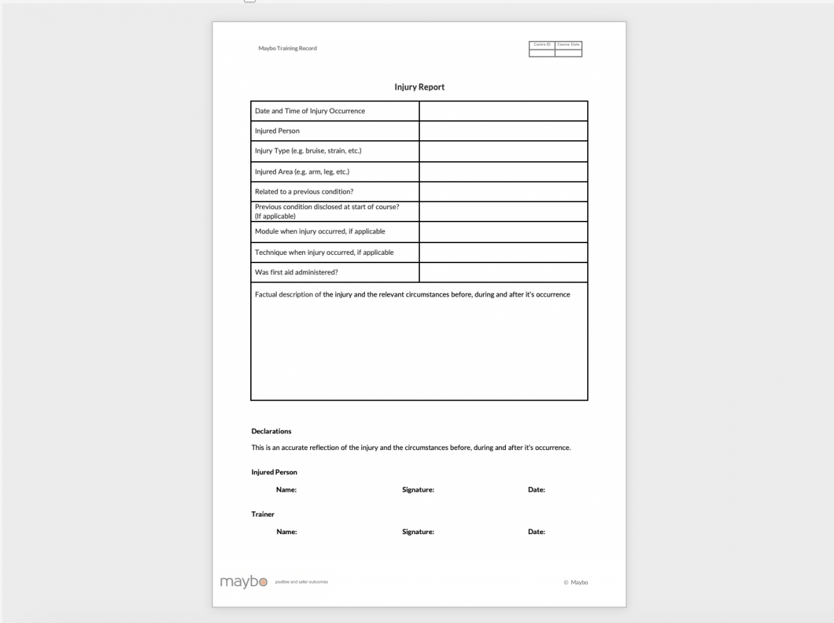 This form should be used to record all known or suspected injuries that occurred in relation to a Maybo training course. Injuries should be reported to Maybo during the online certification process post-course.